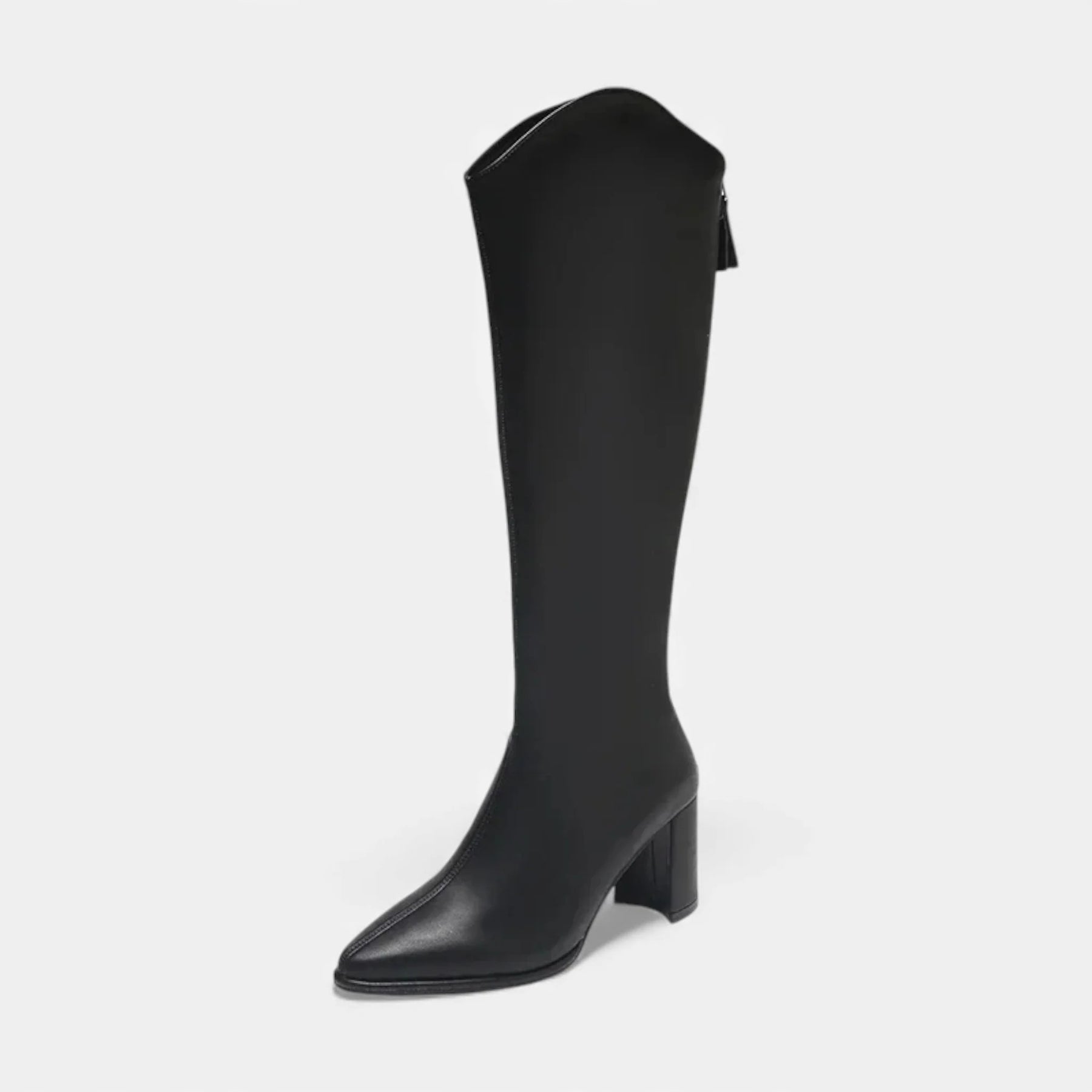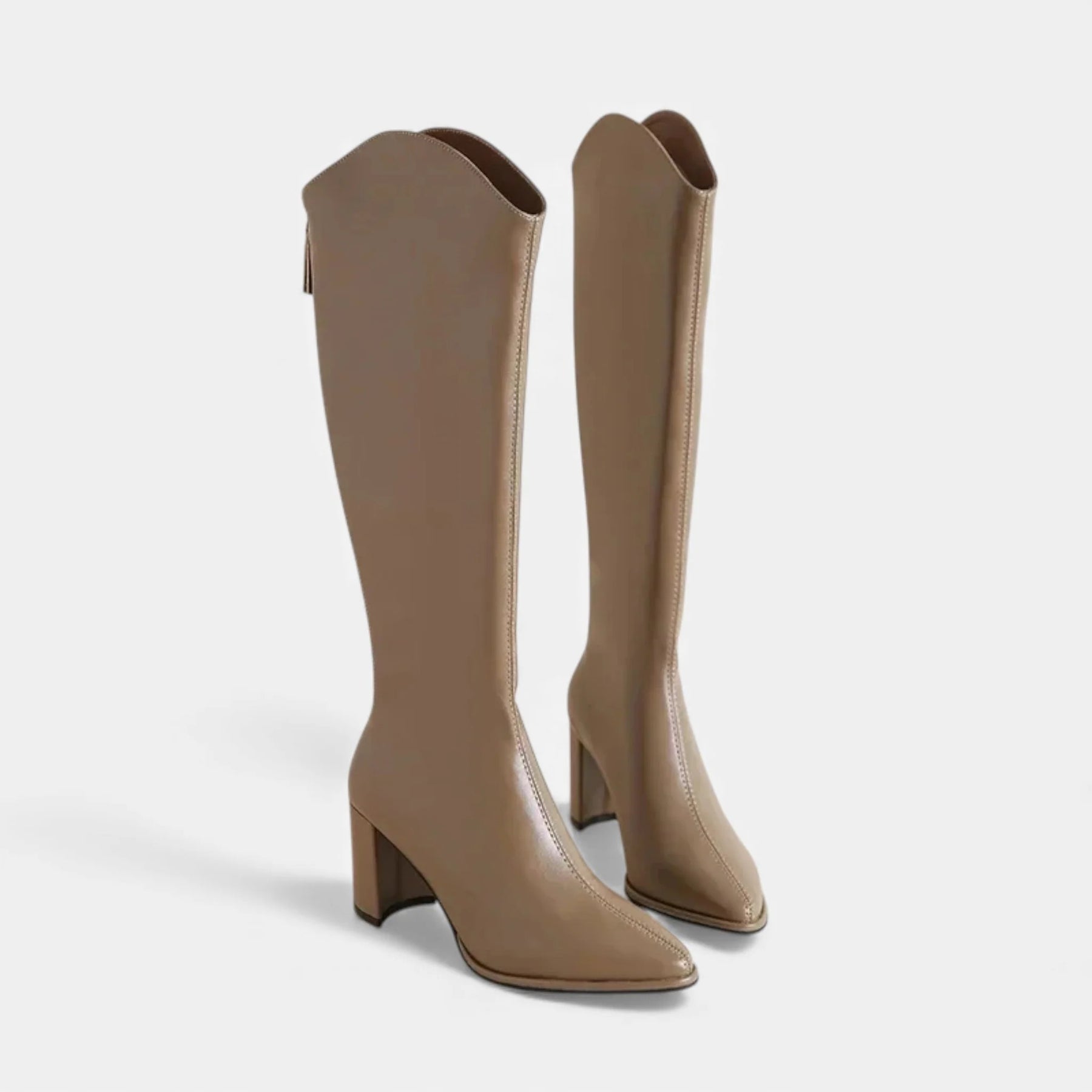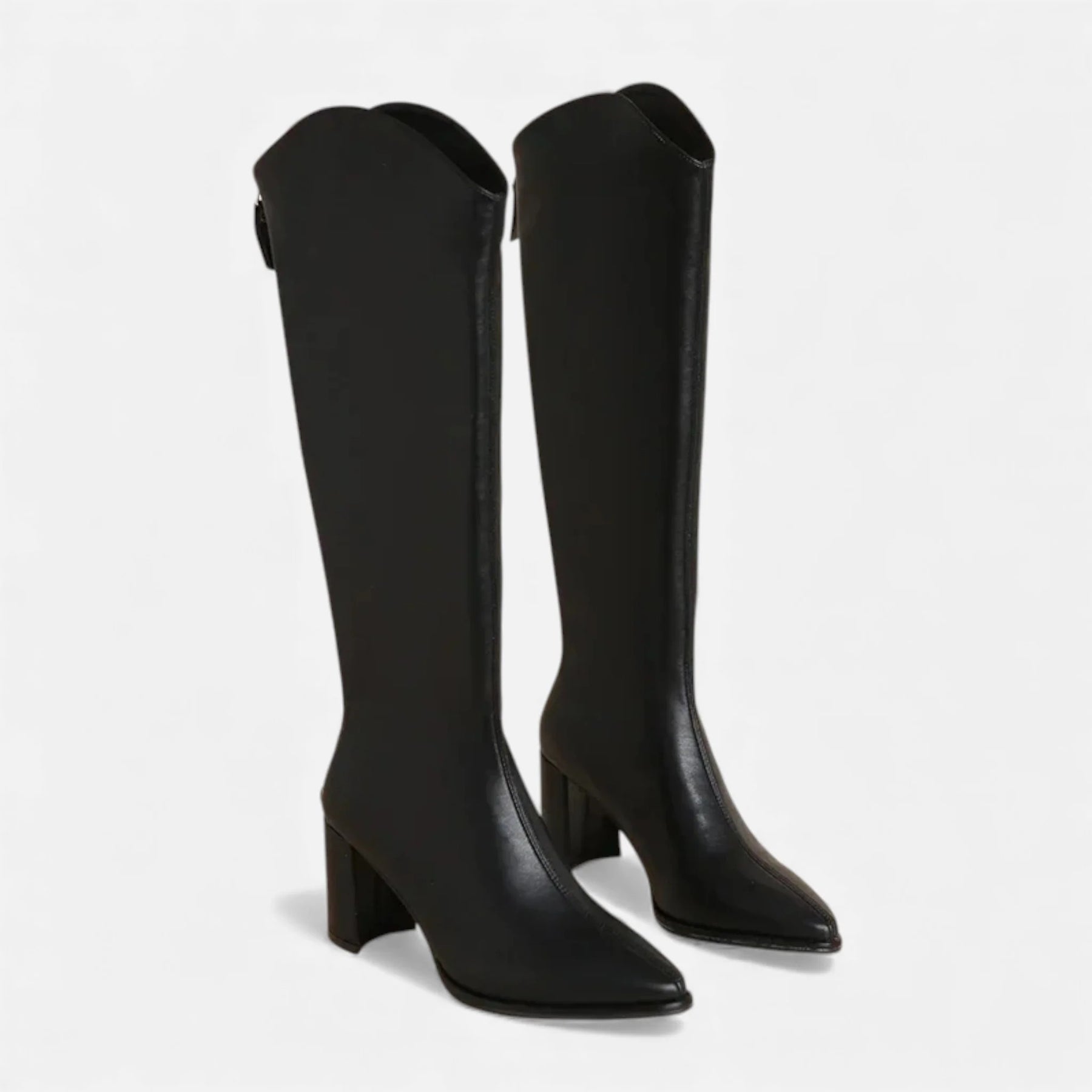 Ontdek de hoge laarzen van Sorata, ontworpen om je silhouet te accentueren met natuurlijke, zelfverzekerde elegantie. De kniehoogte en de stevige blokhak creëren een gestrekte lijn en een verfijnde uitstraling, perfect voor je winteroutfits. De spits toelopende neus en het gladde PU-materiaal geven een subtiele, luxueuze touch die je stijl onmiddellijk verheft.