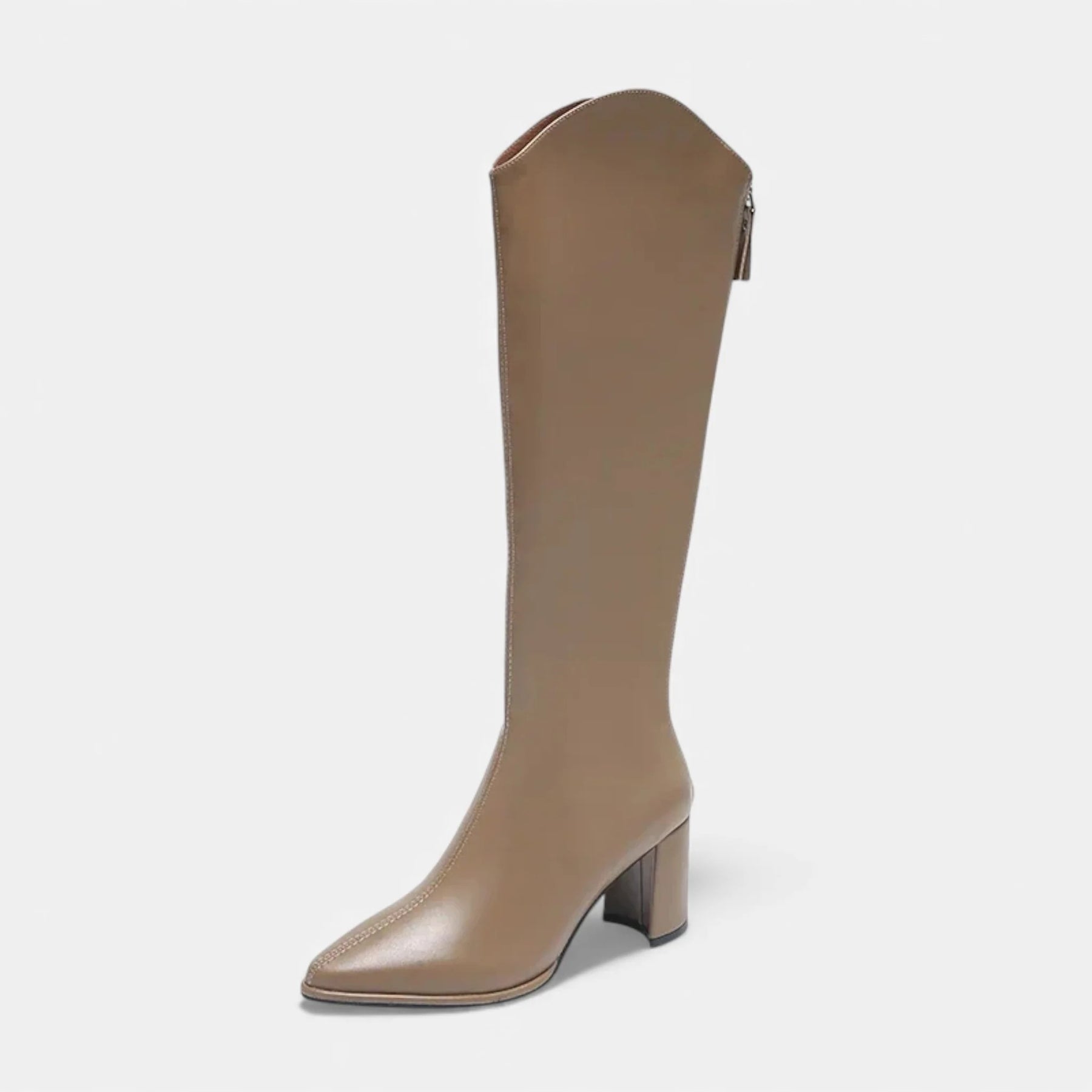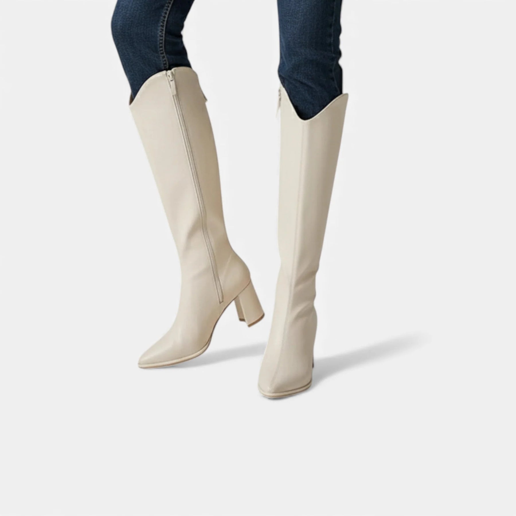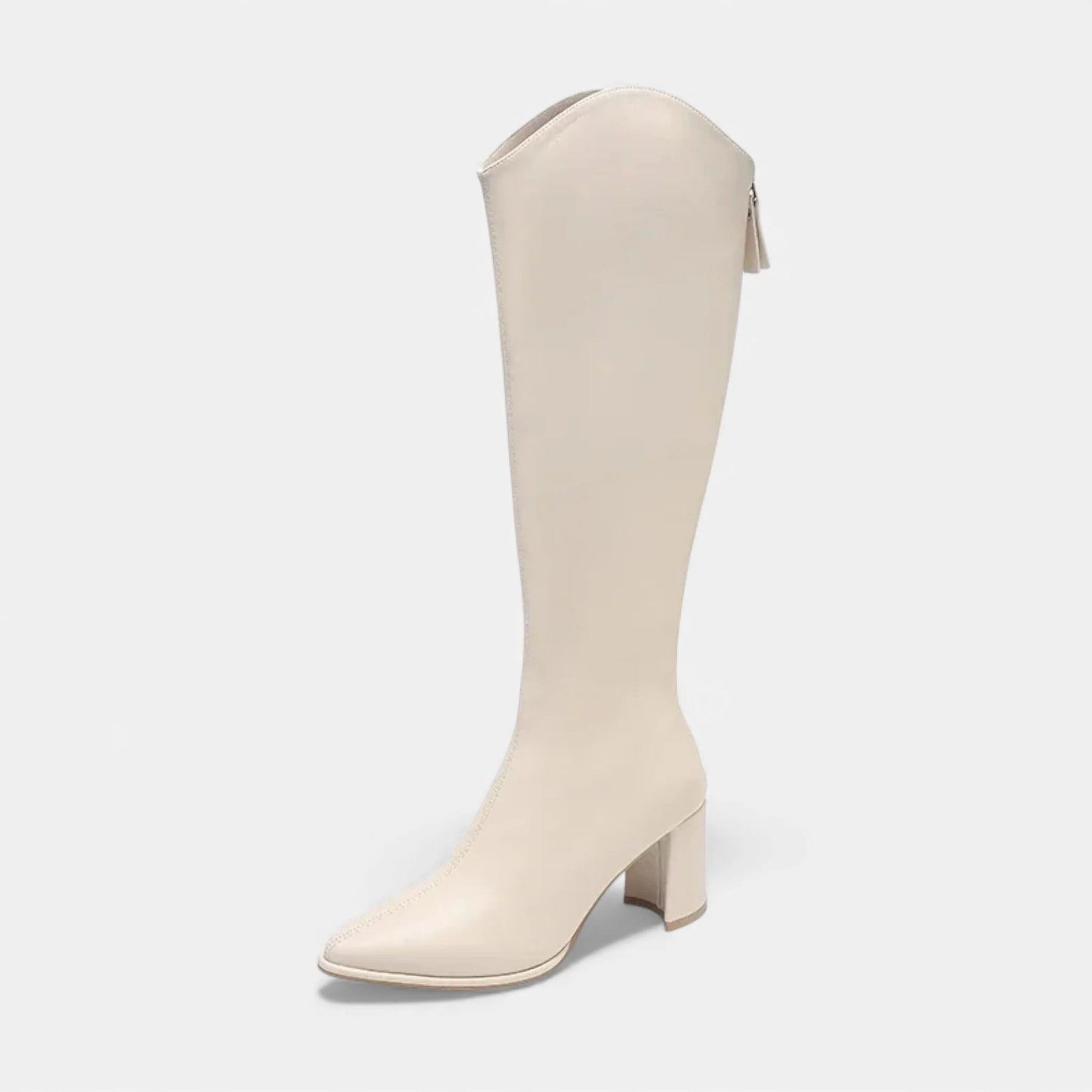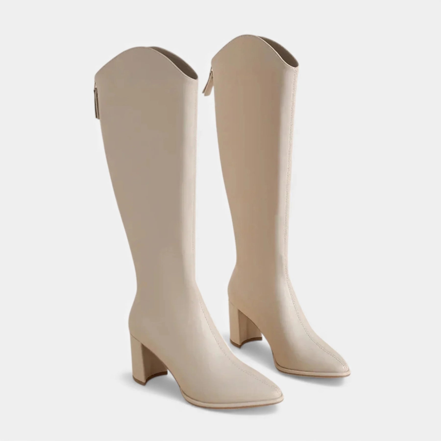 Ontdek de hoge laarzen van Sorata, ontworpen om je silhouet te accentueren met natuurlijke, zelfverzekerde elegantie. De kniehoogte en de stevige blokhak creëren een gestrekte lijn en een verfijnde uitstraling, perfect voor je winteroutfits. De spits toelopende neus en het gladde PU-materiaal geven een subtiele, luxueuze touch die je stijl onmiddellijk verheft.